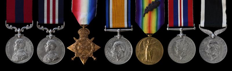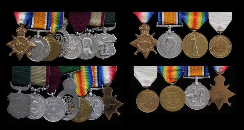 NZ Rare & outstanding Husband & Wife Groups of 7 & 4; Group of 7, 1914-15 Star (modern naming), BWM & VM all impressed to 1/543 MAJOR G. E. SIMEON. NZEF; Colonial Aux Forces Officer's Decoration, KGV, impressed MAJOR G. E. SIMEON RETD. LIST. (hallmarked 1919); NZ Long & Efficient Service, impressed CAPT (TEMP MAJOR) G. E. SIMEON UNATTACHED. LIST (b) (1916), 2nd White Variety; NZ Territorial 12 Year Service, impressed CAPT G. E. SIMEON 5th (W’GTON) REGT 1914, first White variety; & Best Shot in Dist - Otago 1893, engraved WON BY No 281 Act Bomb. G. E. Simeon No. 4 Batt: Permanent Artillery DUNEDIN Best Shot in District. 1893; gVF; & Group of 4, 1914-15 Star, BWM & VM all impressed to H. SIMEON. V.A.D.; & Red Cross War Service, unnamed, YB171A. George Ernest Simeon (Bn Agra, India 11/12/1862, died Auckland 7/7/1943), married Harriet Sandlands in Dunedin in 1893 & worked in Wellington as a clerk. He joined the Armed Constabulary as a Gunner from 11/6/1886 (no. 2813) & served until 31/8/1896. He became Col. Sergt with the Kelburn Rifles (1/3/1902-12/12/1905), Lieutenant with the 5th Wellington Regt until 25/3/12 & unattached as a Captain from 1912 to 1/3/1920.