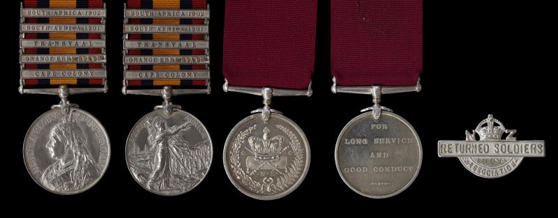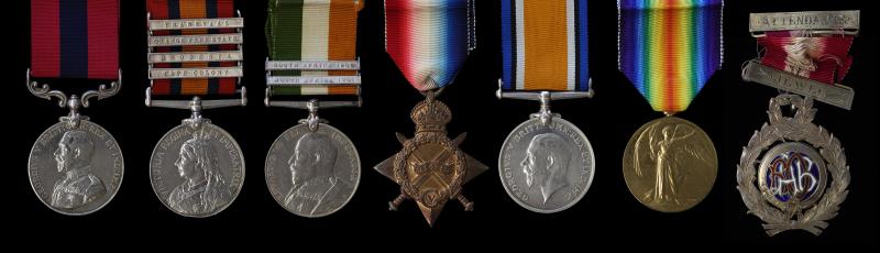 NZ DCM Group of 7, Distinguished Conduct Medal, impressed SEGT J. DAVIDSON PIET RETIEF COMMANDO; Queen's South Africa Medal, hand to R, clasps Cape Colony, Rhodesia, Orange Free State, & Transvaal, impressed 1377 PTR. J. DAVIDSON. NEW ZEALAND M.R.; 1914-15 Star, BWM & VM (Bilingual), engraved King's South Africa Medal, clasps South Africa 1901 & 1902, impressed 1377 SERGT: J. DAVIDSON N. ZEALAND M. R.; 1914-15 Star, BWM & VM (Bilingual), all impressed SJT J.DAVIDSON PR CDO; & RAOB Attendance Jewel, engraved BIRMINGHAM LODGE XI. To BRO. J. DAVIDSON JULY 1. 1903. Just 170 KSA medals were awarded to NZ contingent members. From Balclutha, Otago & originally a butcher, John Davidson (born 5/10/1872, educated in Balclutha, died South Africa,11/3/1922), went to South Africa with the NZ Mounted Rifles, 4th Contingent. He transferred to the 7th contingent as 4670 Quarter-Master Sergeant. He received an MID with Colonel Rutherford for gallantry in bringing wounded men out of action under close fire on 5 October 1901.