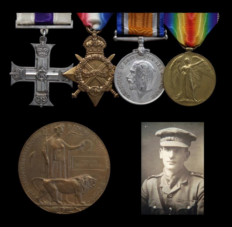 NZ Military Cross Group of 5, MC unnamed as issued, 1914-15 Star BWM & VM all impressed 6/645 2/LIEUT N R HARPER. N.Z.E.F., & Memorial Plaque named Norman Robert Harper. Harper, a Surveyor, enlisted from Waiuta, Westland, on 13/8 1914, & left New Zealand on 16 October 1914 as a Lance Sergeant. He served with the Canterbury Regiment & 28th Reinforcements in Egypt, Gallipoli, & the Western Front. His MC was for "conspicuous gallantry and devotion to duty. He showed great promptitude & skill in filling a gap in the line & organising the new line until severely wounded in the head. His courage & leadership inspired his men, & materially contributed to the success of the operation." He was wounded in action on 14 April 1918 & died of wounds the next day. With photo & vendor records, scroll and King's message with Memorial Plaque. gVF - EF