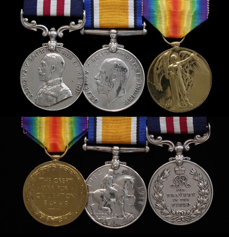 “For conspicuous gallantry and devotion to duty. On 2nd October 1917, in the Sector east of Ypres, Private Edward William Pullar was in action as a Company Runner. On the day referred to, this runner, in clear daylight, while under heavy shellfire and while being sniped at by the enemy, took an urgent message to the Front Line over open ground (there being no communication trenches) and returned to the Company Headquarters. Immediately afterwards he carried an urgent report back again 500 yards across the open ground through heavy enemy shellfire.” He was killed in action in the First Battle of Passchendaele on 12 Oct 1917. His father who was part of the same line assisted at the last rites. With research & service records. VF - aEF