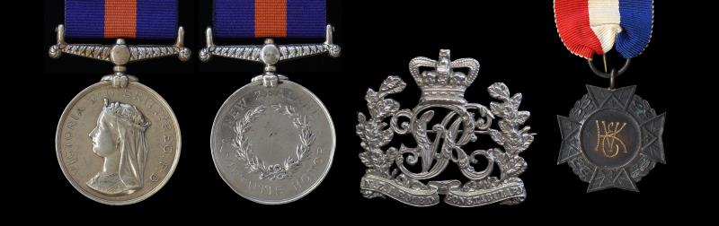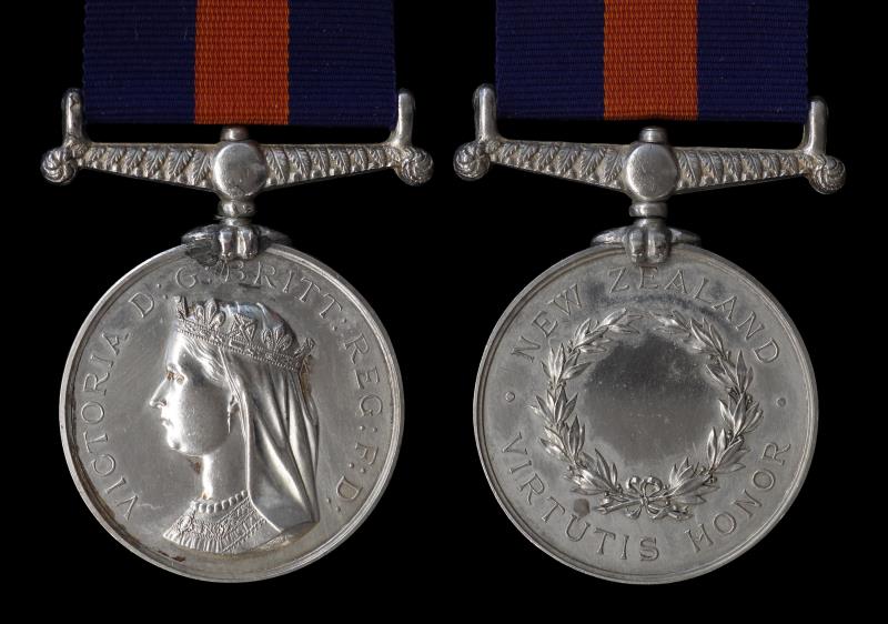 NEW ZEALAND MEDAL Group (3), NZ Medal undated, impressed in small capitals SUB. INSPR. G. O'HALLORAN. A.C., appears to be ex mount & e/k's on Rev, otherwise VF; Kings Empire Veterans Assn Cross, Rev WORRAL & SONS AUCKLAND, OD129, EF; & Armed Constabulary Badge, Oldham1/1, lugs intact, EF. George Stuart O'Halloran (7 September 1845 - 1 December 1910, Auckland) was a Captain in the Colonial Defence Force, Wellington 3/12/1863 - 5/11/1864 & in the Patea Yeomanry Cavalry (to 16/3/1868) from 1866 to 1871. With the Armed Constabulary, he served at Opotiki 1865, Ohinemutu, & Moturoa in 1868. He was one of just 33 Armed Constabulary Officers to receive the NZ Medal. Importantly, he was present at Te Ngutu-o-te-manu when von Tempsky and O'Halloran's colleague Captain Buck were killed in 1868. He wrote an important account of his life, including that incident. With a copy of O'Halloran's extensive manuscript, photos & extensive other research. VF – EF [Note: description has been updated since the catalogue was printed].