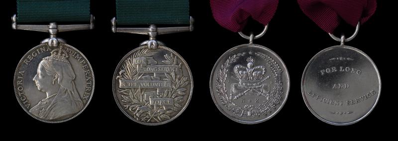 NZ (2), Volunteer Long Service Medal, Victoria Imperatrix, engraved, impressed CAPT. & QM.R. THOMAS C. SELF. V.D. “RETIRED LIST” N.Z. VOLS. (1904), MYB257; & NZ Long & Efficient Service Medal (Kohn type), engraved QTRMASTER THOMAS. C. SELF. UNATTACHED ACTIVE LIST N.Z. VOLS. Thomas Chambers Self (Bn about 1842, London, died Auckland 1909), migrated to Auckland in 1862 & was a tailor. In 1880 he was a Sub-Lieut of the Victoria (Auckland) Rifle Voluntee. In 1883 he was promoted to Lieutenant, & was Capt & Quartermaster from 1887. The local paper reported “The promotion of this officer cannot but be gratifying to his comrades in arms, for he is an experienced drill and competent and experienced officer and the manner in which he carried out the duties of quartermaster during the encampments at Papatoetoe and Takapuna proves the appropriateness of the promotion.” gVF [Note: description has been updated since the catalogue was printed].