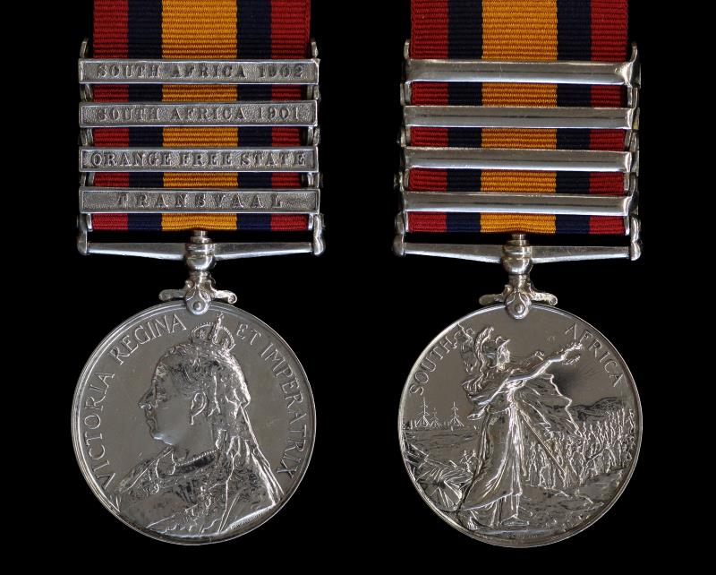 NZ Queen's South Africa Medal, 4 clasps, Orange Free State, Transvaal & South Africa 1901 and 1902, hand to F, impressed 4160 TPR. L. M. ESPAGNE. 7th N. Z'LAND M. R. Leo Mylin Espagne, born 30 May 1875, a Schoolmaster in Hawera, served overseas with the 7th contingent from 6 April 1901 until 25 June 1902. He was promoted to Pay Sergeant at the end of his service in South Africa. He also enlisted for WWI, serving at Featherston under no. 84257 as a Gunner. He died on 4 February 1966. gEF