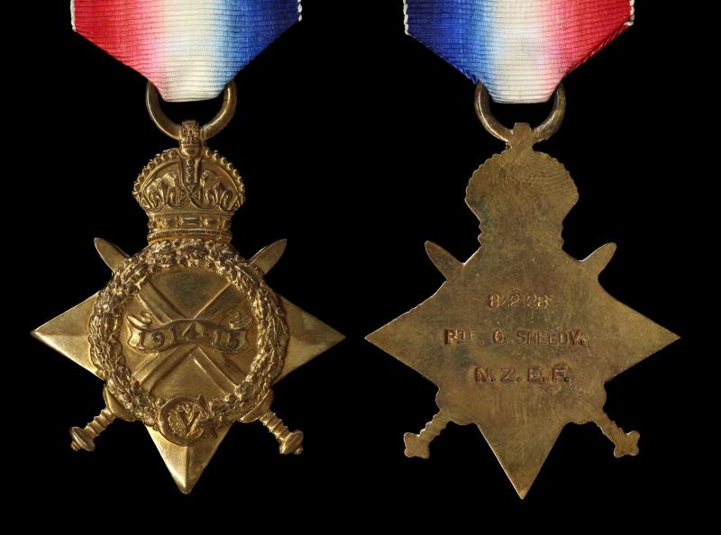 NZ 1914-15 Star impressed 8/2128 PTE. G. SHEEDY. N.Z.E.F. George Sheedy, (15/2/1878 - 23/12/1928 at Liverpool, Australia) originally from Marton, enlisted as a Labourer, giving a Sydney address, was wounded in action at Gallipoli on 12 June 1915, & served in Egypt & the Western Front before discharge with war wounds to New Zealand on 7/5/1917. EF