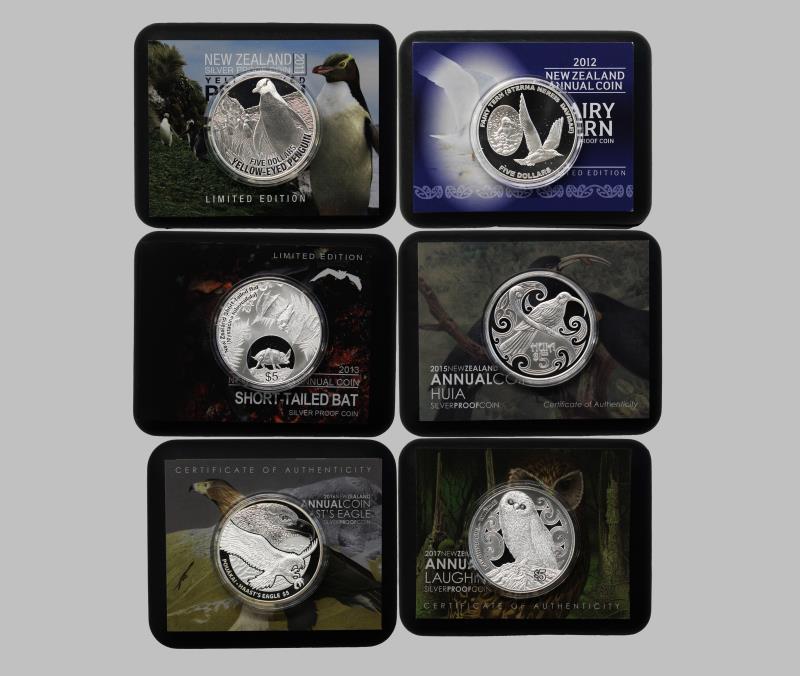 PROOF $5 (6), 2011 Yellow Eyed Penguin; 2012 Fairy Tern; 2013 Short-tailed Bat; 2015 Huia; 2016 Haast's Eagle; & 2017 Laughing Owl. All .999 silver, total 6 oz ASW, all cased with certs.
