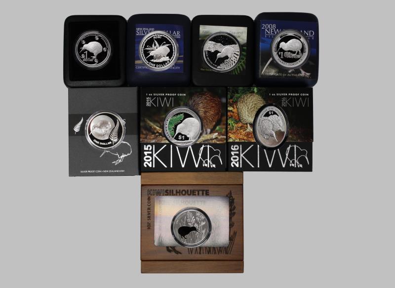 PROOF $1 KIWI (8), 2004 Little Spotted Kiwi; 2005 Rowi; 2007 Great Spotted Kiwi; 2008 Haast Tokoeka; 2011 Kiwi Icons; 2015 Brown Kiwi; 2015 Kiwi Silhouette; & 2016 Great Spotted Kiwi (Oval); all .999 silver, 8 oz ASW.
