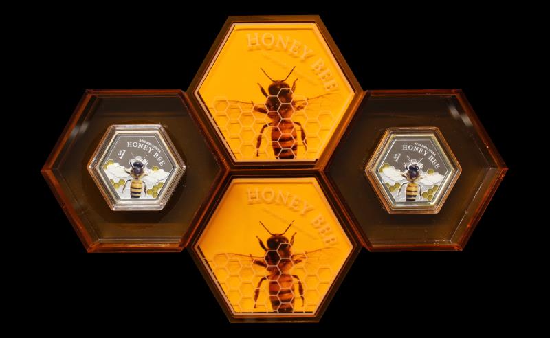 PROOF $1 2016, Honey Bee (2), hexagonal, .999 silver, total 2 oz ASW, cased & boxed with cert.