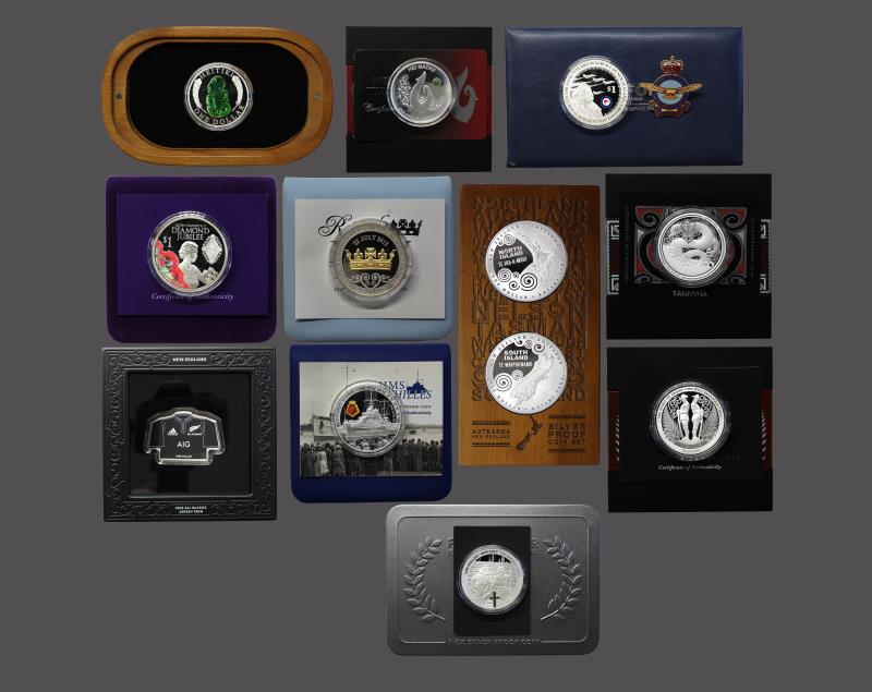 PROOF ISSUES (12), $1 (11), 2010, Heitiki; 2012 (3), Hei Matau, RNZAF 75 years, & Diamond Jubilee; 2013, Royal Baby; 2014, Aotearoa Pair (2), & HMS Achilles; 2015, All Blacks Jersey; 2017 (2), Darkest Hour, & Taniwha; & 50c 2015, Spirit of ANZAC; all .999 Silver, 12 oz ASW, all cased & boxed with certs.