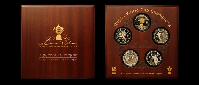 PROOF SET 2011 RUGBY CUP WORLD CHAMPIONS, coins from NZ (2), Australia, England, & South Africa, all .999 silver, total 5 oz ASW, housed in wooden case.