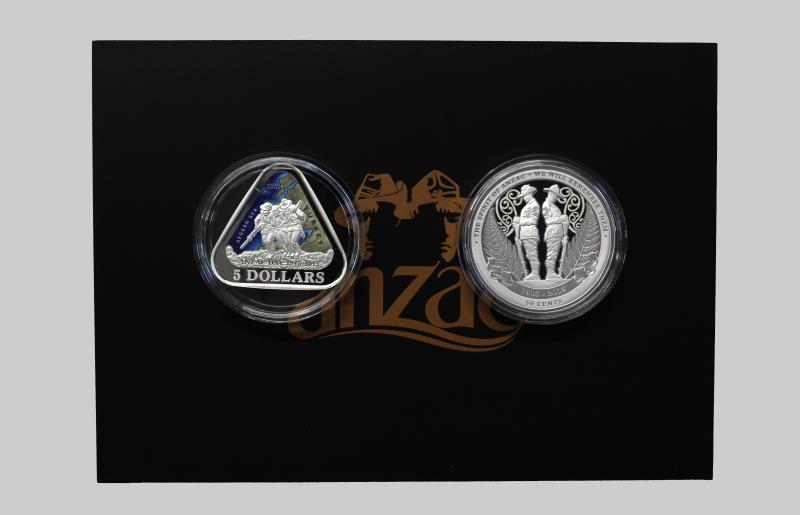 PROOF SET 2015 ANZAC (2), NZ 50c & Australia $5 coloured triangle, both .999 Silver, 1.784 oz ASW, cased & boxed with cert.