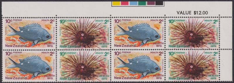 1979 10c Marine Life top right corner horiz imprint/sheet value block of 8 (4 setenant pairs) - the 4 sea urchins (& imprint square) clearly double green. CP T51by. Cat $1000+. MUH.