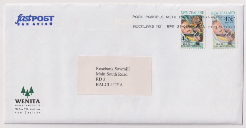 1996 40c Teddy Bear error self adhesive, used on commercial cover, Auckland to Balclutha. This is the cover mentioned in NZ Stamp Collector Vol 84, No 3 Sept 2004, when a Teddy Bear stamp was mistakenly used for postage. Auckland 21 Nov 1996 inkjet cancel. CP T68by. Cat $10,000.