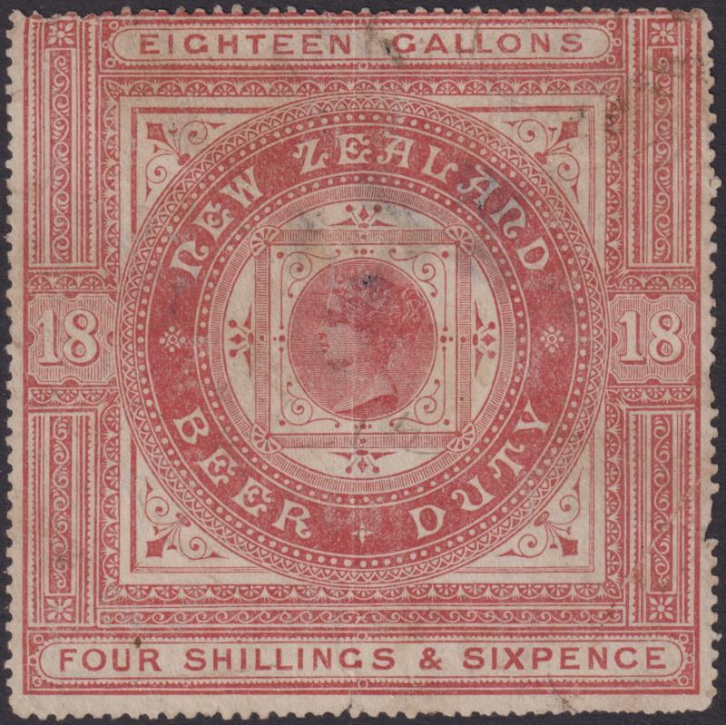 1883 4/6d Beer Duty, thinned but intact. Kiwi R32.
