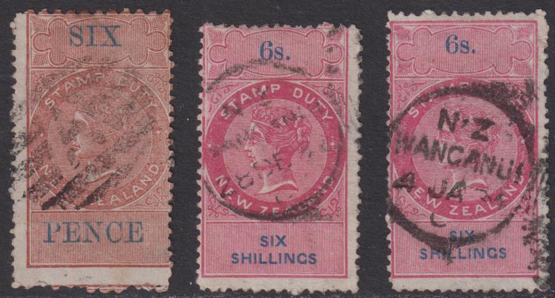 1873 6d & 6/- x 2 all with postal cancels - 6d barred "A", 6/- both Wanganui "A" class cdss (28 DEC 1882 & 4 JAN 1884). All large "NZ" wmks (16 x 6mm) - 6d p10 x 12½, 6/- p12½. Neither listed by SG or CP.