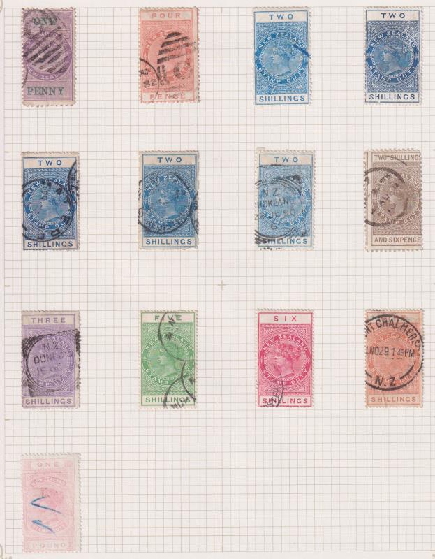 c1882 page of 13 QVLTs – mostly PU. Includes: 1872 1d die II & 1882 4d, both with Christchurch duplexes (4d is clearly dated 82); 2/- (with plate crack) & £1 with blue accounting marks; 6/- & 9/- with cds.
