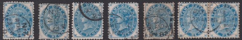 1882 1d blue Stamp Duty x 7 incl horiz pair. All with fine cdss - 6 clearly 1882 (of which 5 are between March & May), 1 with invtd wmk. CP Z1b/y, cat $1100. A rare assemblage. SG F2/w. FU.