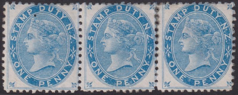 1882 1d blue Stamp Duty blue horizontal strip of 3 with inverted watermark. Listed by CP as Z1b(Y) but only priced used at $500 each. Mint, some gum sweating.