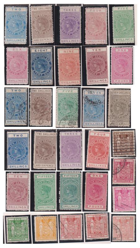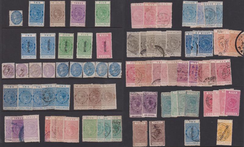 1882-1920s seln of 9 mint on Hagner. Noted 5/- MUH & Officials (2/- x 2, 5/- x 2, & £1 (with tone spot)). Also incl 1d blue QV mint & seln of 60 used QVLT to 30/- almost all fiscally used.
