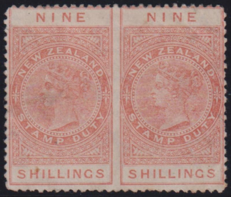 1895 9/- horiz pair, p11 imperf between. Slightly soiled. A great rarity. Brandon cert (2001). SG F65a. Cat £3500 (does not reflect rarity).