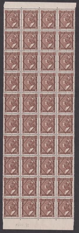 1935 3d Wahine chocolate block of 40, single wmk, p14 x 13½ (4 complete vert columns of 10 with sheet selvedge at top & bottom). Folded between rows 5 & 6. Fine. CP L6a. Cat $3200. MUH. Ex K Moir.