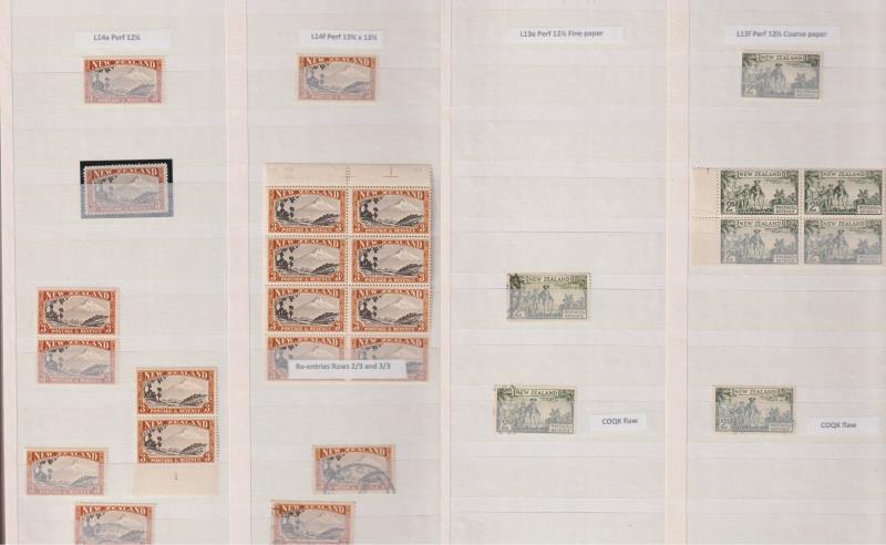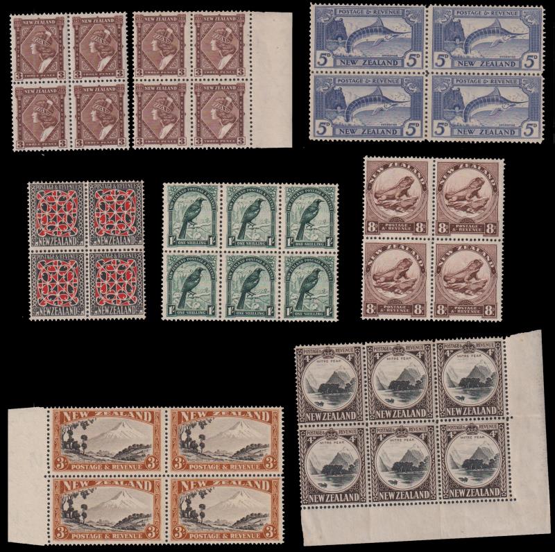 1936-42 ½d - 3/- extensive specialised mint/MUH colln of 380 stamps, multiple wmk paper, neatly laid out on pages. Mint are almost all light hinged, often in block with 2 or 3 MUH. A feature of this colln is the large number (80) of blocks of 4 (or larger), incl many shades, plate flaws, retouches & plate number blocks of 4, virtually all in fine condition. Plate blocks (all diff) incl ½d x 5, 1d x 5, 1½d x 2, 2d x 5, 2½d x 3, 3d x 1, 4d x 2, 5d x 6, 6d x 4, 8d x 3, 1/- x 1, 2/- x 3, 3/- x 1. Noted 2d with "tekoteko" flaw (2 fine examples in blocks of 4, cat $1350), 2d p14 plate blocks 2A, 2B (cat $800), 3d block of 4 (3 MUH), 3d plate 2 block of 4, 3d invtd wmk block of 4 with selvedge MUH, 5d p12½ fine paper pl 1 block of 4 MUH (1 faint gum tone spot), 5d ditto pl 2 coarse paper block of 4 MUH (each cat $800), 6d p13½ x 14 pl 1 block of 4 with large plate crack MUH, 9d x 2 diff single wmk multiples (block & pair) with some gum tone, 2/- p12½ coarse paper pl 1 block of 4. Generally a very clean & attractive lot. CP cat $13,500. Ex K Moir.