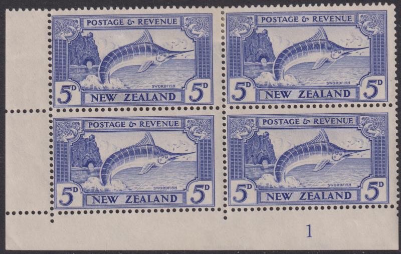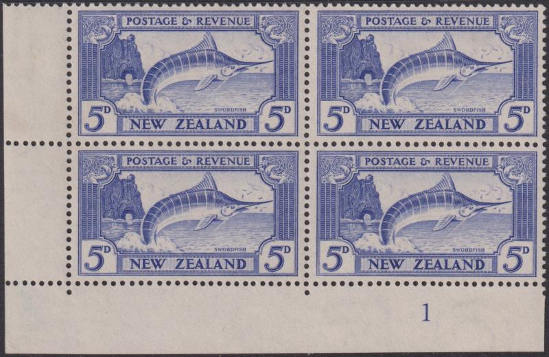 1935 5d Swordfish ultramarine plate "1" block of 4, single wmk, p13½ x 14. Upper 2 stamps mint (& 1 with gum bends visible on back), lower 2 MUH. CP L8b. Cat $1800. Ex K Moir.