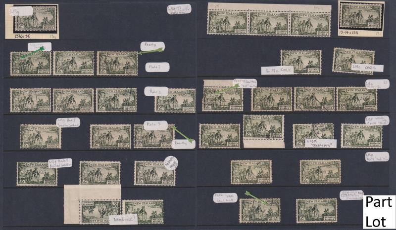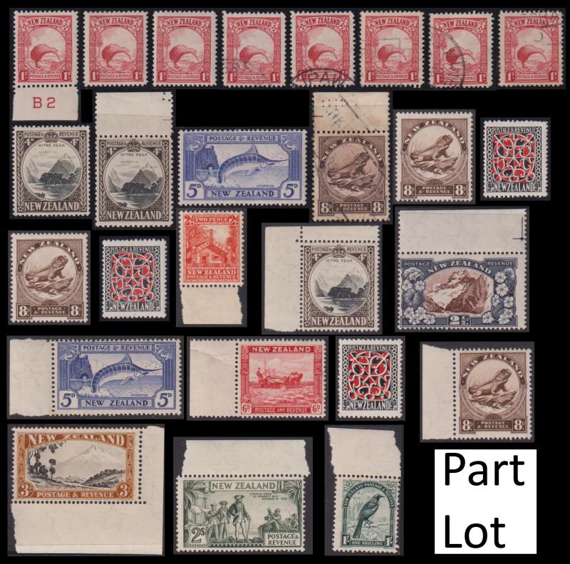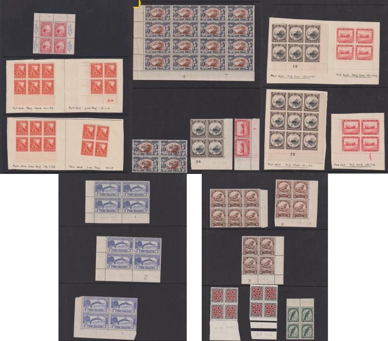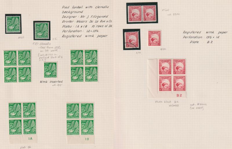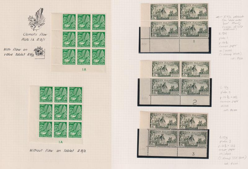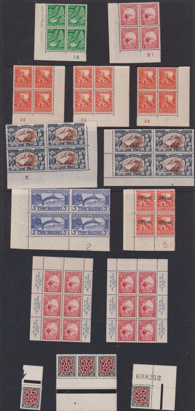 1935-42 plate blocks of 4 seln: 1) ½d Fantail single wmk plate 1A MUH; 2) 1d Kiwi single wmk plate B1 MUH; 3) 2d Whare fine paper plate 3B & coarse paper plates 3A & 3B MUH; 4) 2½d Lilies p14 comb plate mint & p13¾ x 13½ plate 4 MUH (5), 5d Swordfish p13¾ x 13½ plate 2 mint; 6) 2d Whare coarse paper Official plate 5A MUH. Also incl 1d Kiwi p14 x 13½ Die 2 booklet panes x 6 x 2 with binding selvedge upright & invtd wmk panes & 9d Maori Panel p14 x 15 wmk single with selvedge MUH. CP cat $1270+.