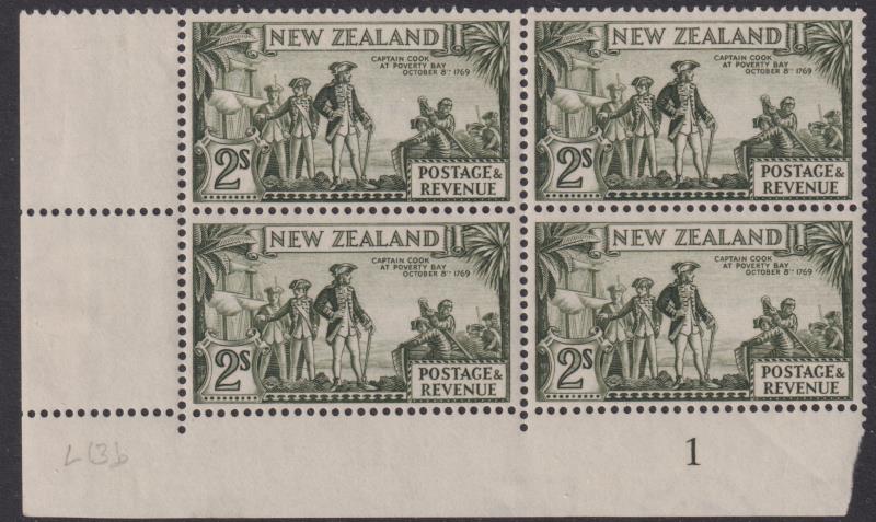 1935 2/- Cook deep olive-green plate "1" block of 4, single wmk, p13½ x 14. Rare. CP L13b. Cat $2000. Upper 2 VLH mint - virtually MUH, lower 2 MUH. Ex K Moir.