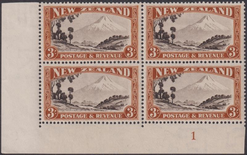 1935 3/- Mt Egmont sepia & yellow-brown plate "1" block of 4, 1st issue, single wmk, p14-13 x 13½. CP L14a. Cat $1750. 2 VLH mint, 2 MUH. Ex K Moir.