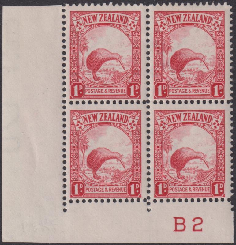 1936 1d Kiwi red plate "B2" block of 4, single wmk, p13½ x 14 (selvedge at left imperf horiz). 2 LH mint, 2 MUH. CP L2b. Cat $2000. Ex K Moir.