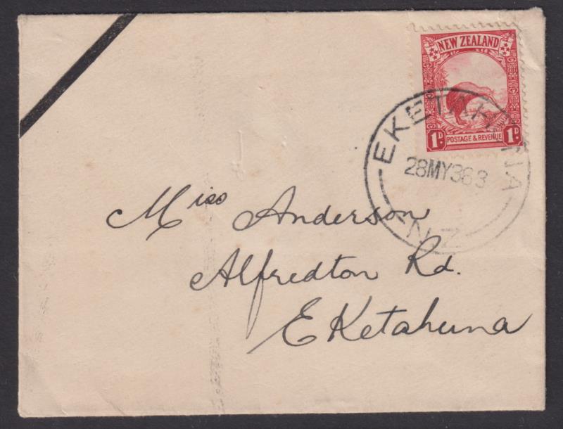 1936 1d Kiwi (die I), single wmk, p13½ x 14, superb used on local Eketahuna mourning cover with 28 May 1936 "J" class cds. A most attractive cover - possibly the earliest known surviving today.