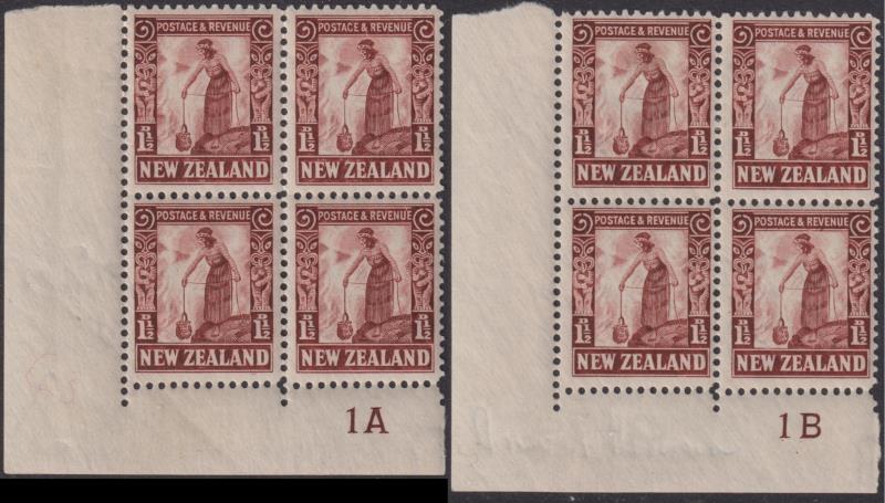 1936 1½d Maori Cooking red-brown set of 2 plate blocks of 4, single wmk invtd & reversed, p13½ x 14. Plate "1A" MUH & "1B" mint/MUH (2 VLH mint, 2 MUH). CP L3c. Cat $2250. Ex K Moir.