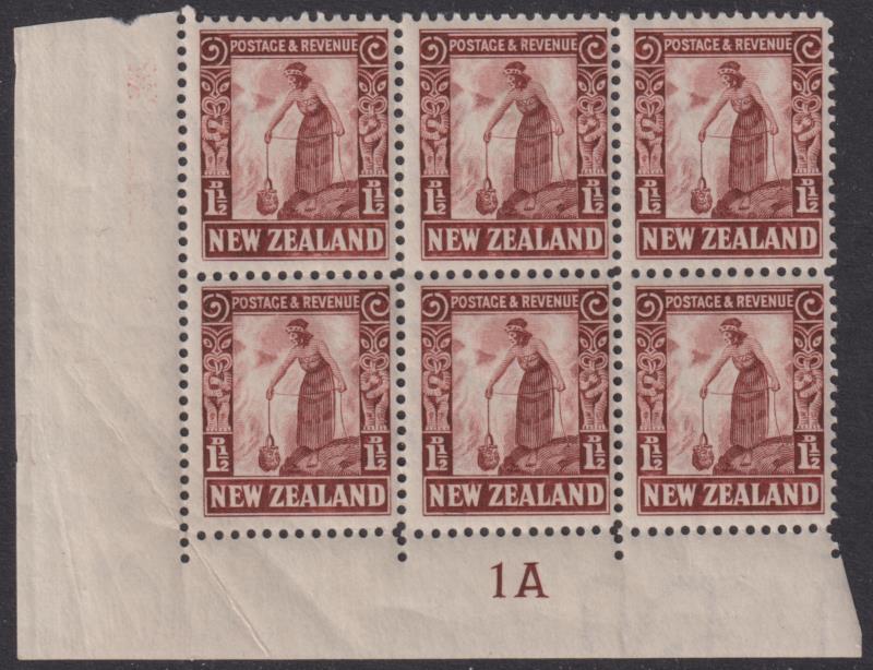 1936 1½d Maori Cooking red-brown plate "1A" block of 6 (rather than 4), single wmk invtd & reversed, p13½ x 14. MUH (2 with light gum bends visible on back). CP L3c. Cat $1450. MUH. Ex K Moir.