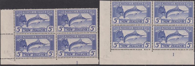 1936 5d Swordfish ultramarine plate "1" block of 4, mult wmk, p13-14 x 13½, (with horiz perfs extending through left selvedge). One stamp mint, 3 MUH (1 with gum bends). Also similar plate block of p14-13 x 13½ variant (no horiz perfs in left selvedge). One VLH mint, 3 MUH. CP L8c. Cat $800. Ex K Moir.