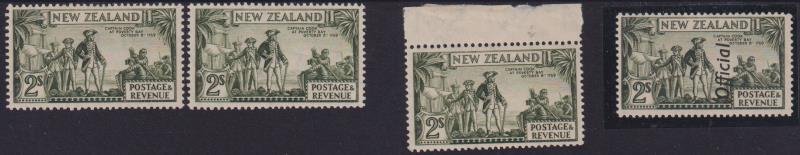 1936-42 2/- Cook seln of flaws: 1) 1936 mult wmk R8/2 "coconuts" flaw mint; 2) 1936 mult wmk R1/6 "hat" flaw mint; 3) 1936 mult wmk R1/4 "COQK" flaw with top selvedge MUH; 4) 1939 mult wmk, p13½ x 14 Official R9/2 "dots over bow" flaw mint. CP cat $1585 (MUH).