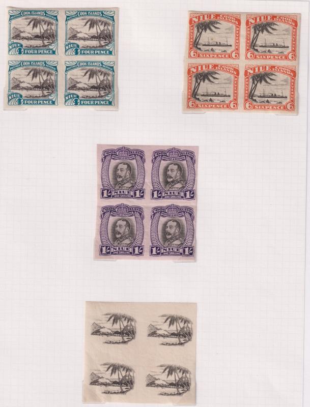 Cook Isl 1932 ½d to 1/- Pictorial set of 7 as imperf plate proof blocks of 4 in issued colours. Also similar centre plate (for 4d) block of 4 in black.