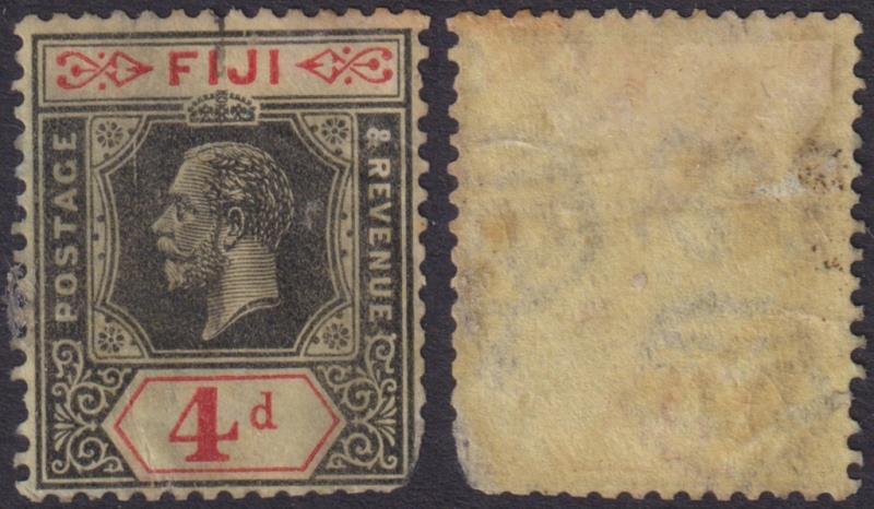 Fiji 1924 4d GV black & red-yellow (die II) wmk "mult. Script CA" inverted. Not catalogued by SG but the equivalent with "mult. Crown CA" is cat £475 mint. Lower right corner with short perfs. FU.