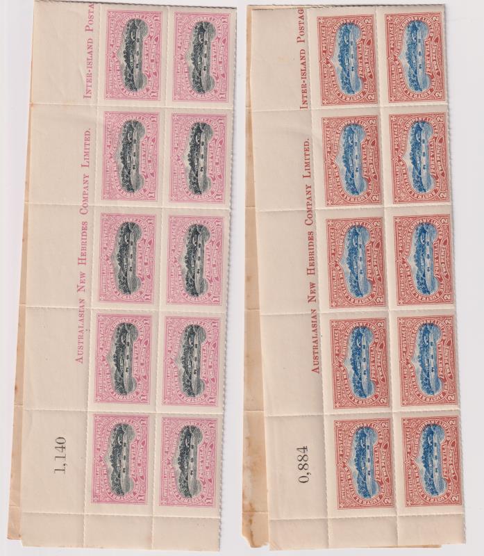 New Hebrides 1898 1d & 2d Interisland Locals set top 2 rows of sheet 10 x 2 with sheet markings (1 fold each). Minor selvedge blemishes. MUH.
