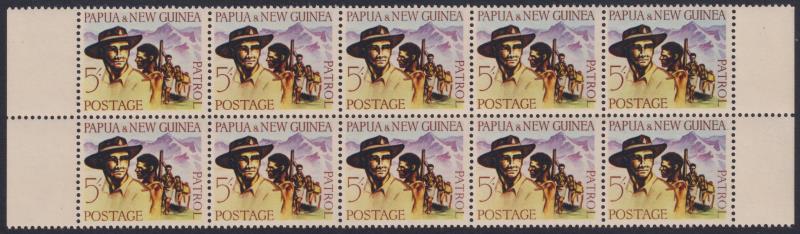 Papua New Guinea 1961 unissued 5/- Native Patrol horizontal block of 10 with both side selvedges (these stamps were printed in 1961 for release in 1962, but the design was rejected & the vast majority of the stock was burnt, except 2 or 3 sheets of 60 kept for archives). Rare & sought after item. MUH.