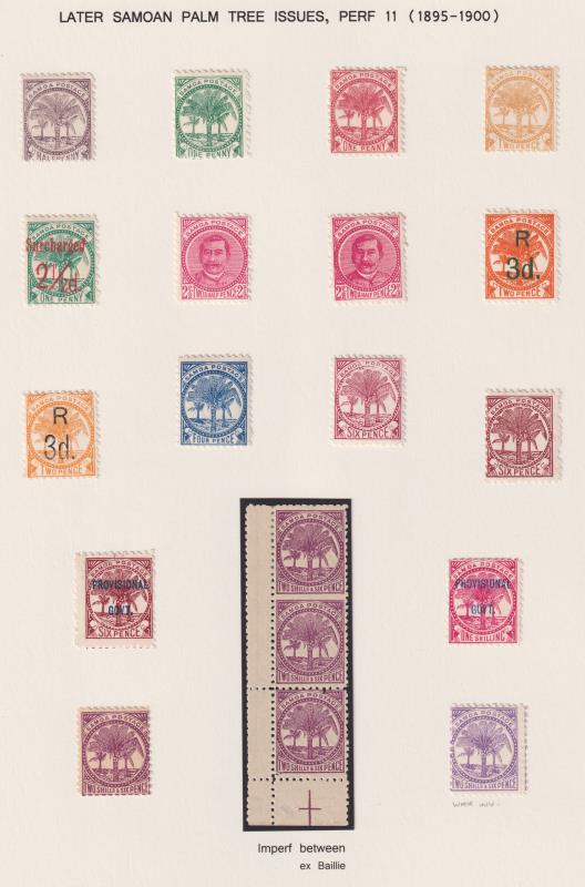 Samoa c1895-1900 Palm Trees range of 19 values, p11. Incl 2/6d vert strip of 3 incorporating imperf between left selvedge variety (vert pair) SG 64ba (cat £450+). Ex Baillie. Odenweller states that a total of 48 pairs with this variety were produced (The Stamps and Postal History of Nineteenth Century Samoa, p147).