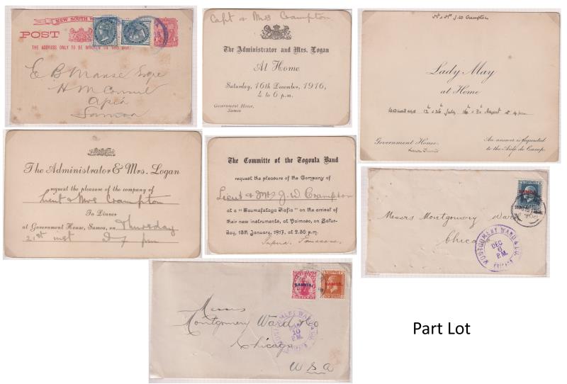 Samoa 1898-c1990 eclectic range of 53 covers, p/cs & items of ephemera on 37 pages, extensively written up. Noted: 1898 p/c NSW-Apia canc scarce cds "N.Z. Marine P.O. R.M.S. Alameda" (most of text visible); 2 WWI invitation cards ex The Administrator & Mrs Logan, 1 ex Togouta Band, & 2 earlier (1911 to same NZ Military Officer) ex Lady May (wife of Governor of Fiji); 1920 fine reg'd covers x 2 with a) 6d Victory ovpt; b) 6d, 1/- Victory ovpt; 1925 stampless official cover to NZ franked fine "Samoa/Government House/Paid" circ h/s, from Sir George Richardson, 3rd Administrator of Samoa; 1929 fine 5½d rate reg'd cover to Germany; 1935 cover to NZ with violet oval d/s "Postal & Radio, Apia"; 1938 reg'd cover Tuasivi-Apia, 1938 cover GB-Samoa with fine crash cachet ex flying boat "Calpurnia"; 1964 cover carried on Wm. Willis raft Samoa-Queensland; 1978 A.R. card NZ-Apia; 1989 cover Tokelau-NZ with fine "Missent to Western Samoa" cachet. Also American Samoa 1931 cover with "Swain's Island" h/s, 1934 cover ex U.S.S. Whippoorwill at Pago Pago, 2 WWII 1943 covers ex US troops at Pago Pago & Faleolo (all fine). Ex Don Mee.