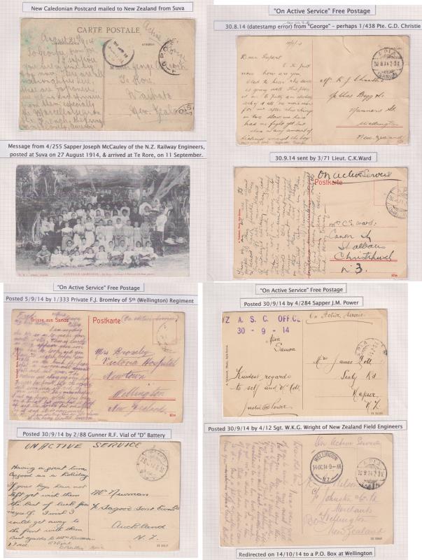 Samoa 1914 WWI "On Active Service" stampless mail (7 PPCs) from Advance Occupation Force troops. Noted rare convoy PPC (showing New Caledonia school children) ex Sapper J. McCauley of NZ Railway Engineers, posted (in transit to Samoa) at Suva, Fiji 27/8/14 to NZ (rare Te Rore receipt cds 11 SP 14). Also 6 other PPCs ex Apia to NZ 30/8/14-14/10/14 from troops individually identified (1 has rare "N.Z.A.S.C. OFFICE" h/s (used at Apia 30/9/14). Written up on 4 pages. Rare lot. Ex Don Mee.