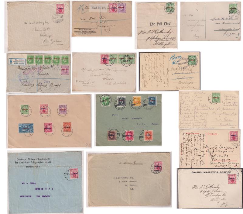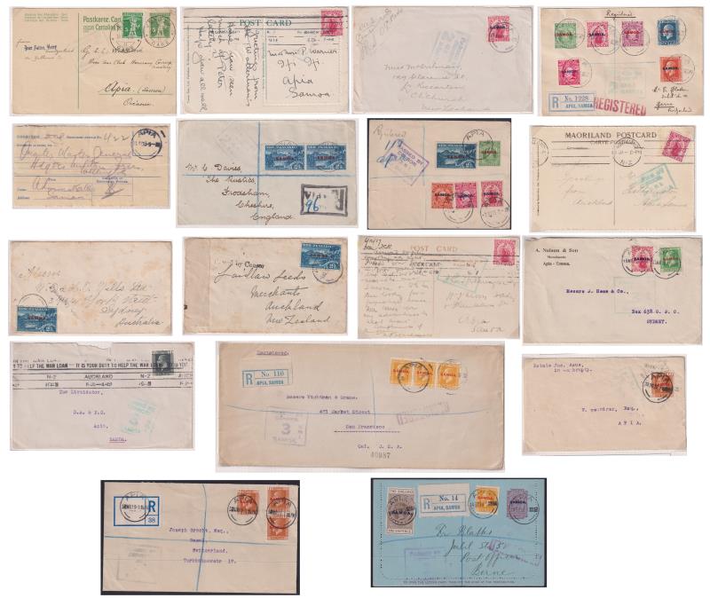 Samoa 1914-18 WWI range of 14 covers & PPCs franked NZ stamps with "SAMOA" ovpt (1st issued 29/9/14). Noted some interesting items incl cover to NZ with 1d canc Apia cds clearly dated "30.8.14" ("8" in error for "9", ie: 2nd day of use); 2 reg'd, incl 1 ex Apia 2.11.14 to NZ with typed regn label, 1 to USA 18 AU 17 with EVII 2d & 5 x ½d GV; 2 ex Tuasivi 25 MR 15 (unaddressed CTO with set of 6 ½d-1/-) & 30 OC 16 to USA (1d & 3 x ½d), canc total 8 Tuasivi cds; Apia local cover to German settler 4 FE 18 with set of 7 ½d-1/- GV; printed cover 31/12/14 ex German South Seas Radiotelegraph Station, Apia. Written up on 11 pages. Mostly fine condition. Ex Don Mee.
