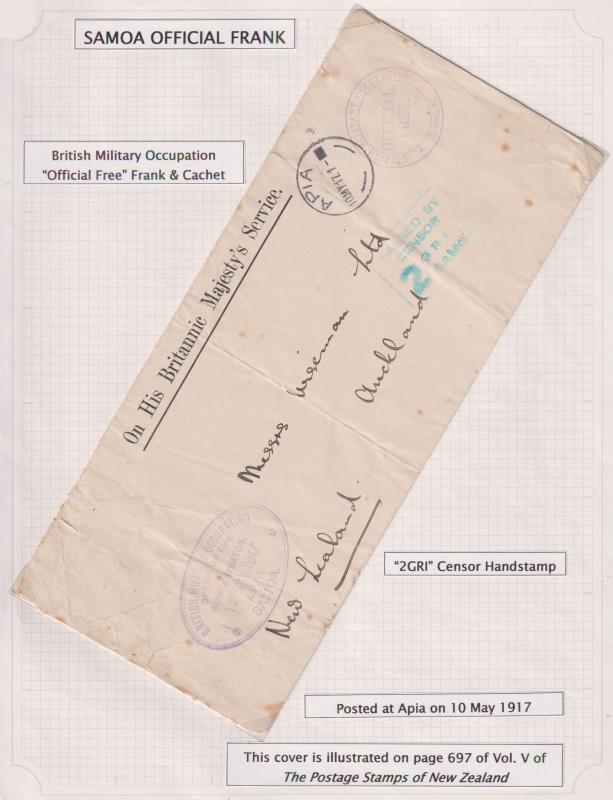 Samoa 1917 WWI stampless official censored cover (long) to NZ, printed "On His Britannic Majesty's Service", franked "British Military Occupation/Official Paid" circular h/s (violet), Apia cds 10 MY 17. Also with clear boxed h/s in green "Passed By Censor / 2/ G.R.I. Samoa" & oval h/s (violet) "British Military Occupation/Office of the Administrator / Apia / Samoa" 10 MAY 1917. Two vert folds & a few small tone spots. Illustrated RPSNZ Vol 5 p697. Scarce item. Ex Don Mee.