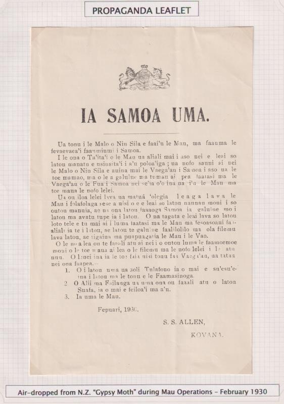 Samoa 1930 (Feb) official propaganda leaflet (in Samoan language) 14 x22cm, dropped from NZAF "Gipsy Moth" aircraft "995" during the Mau rebellion. The aircraft travelled from NZ to Samoa aboard HMS Dunedin in Jan 1930. The leaflet is signed by Governor SS Allen & calls on the rebels to surrender. Written up on album page. With scans of relevant articles & translation. Fine condition. Rare. Ex Mee.