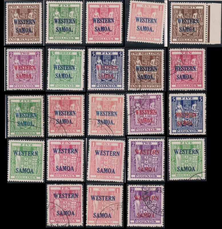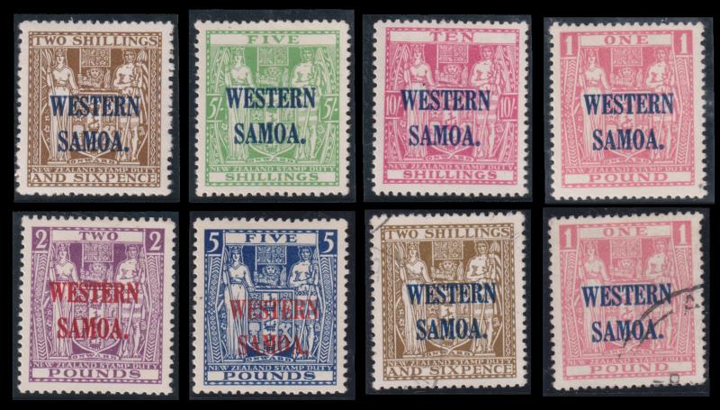 Samoa 1944-8 2/6d - £5 Arms set of 8, "WESTERN SAMOA" ovpt (2.5mm gap), WT paper, multiple upright wmk. LH mint x 5 (incl £3, £5); MUH (10/-, 30/-, £2). Also FU 2/6d, 5/-, 10/- (2 distinct shades), £1, £2. Also 1953 £5 invtd wmk SG 214w MUH (light perf gum tone). All values 30/- to £5 are rare (only 2400 of £5 SG 214 printed, 3840 of £3 & 4640 of £2 SG 212-3). Also 1955 2/6d-£2 set of 4, with wide-spaced "WESTERN SAMOA" ovpt (9mm gap), WT paper, invtd multiple wmk, LH mint & FU. Ex Don Mee (23 items). SG 207-14, 232-5. Cat £2775.