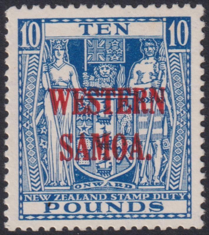 Samoa 1935 £10 Arms deep blue, "WESTERN SAMOA" ovpt (carmine, 2.5mm gap), Cowan paper. Not listed by SG but mentioned after SG 194. Issued for fiscal purposes but also available for postal use (likely philatelic). Rare! Ex Don Mee. VLH mint.