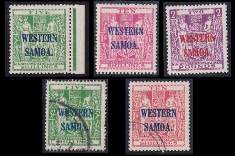 Samoa 1941-2 Arms range of 5, "WESTERN SAMOA" ovpt, single upright wmk. Incl 2/6d, 10/-, £2 mint (£2 with light guarantee h/s on back). Also 5/- & 10/- FU. Rare lot (only 800 of £2 printed, 4000 of 10/-, & 3850 of 5/-). Ex Don Mee. SG 194a-c. Cat £1305.