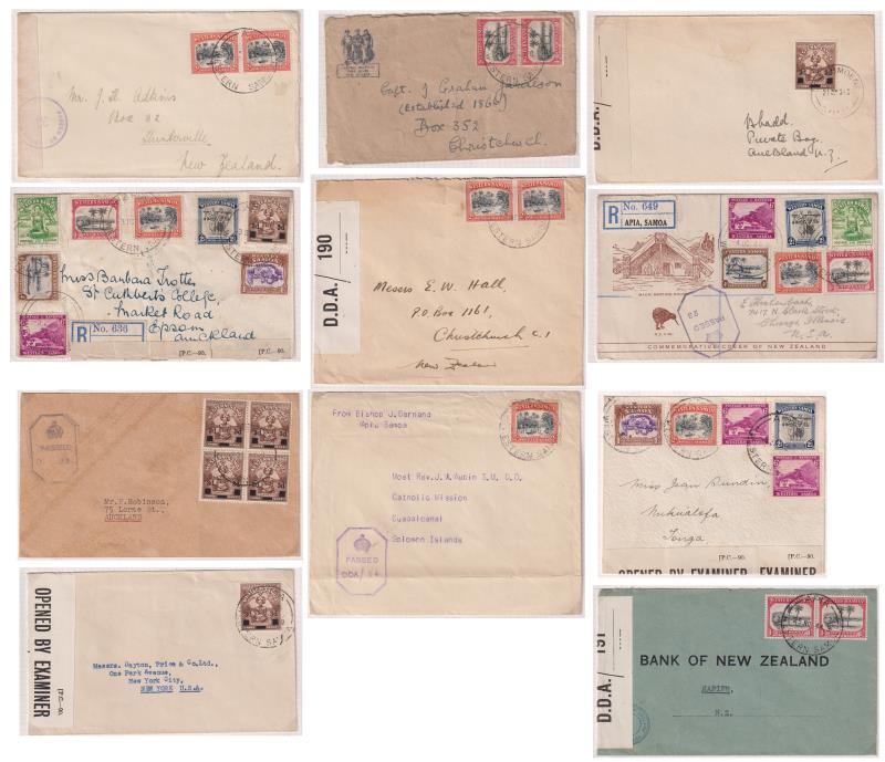 Samoa 1942-5 WWII censored covers x 11, mostly to NZ, incl 6/4/42 with circular h/s "Passed by Censor 37", 7 with "Opened By Examiner D.D.A. ..." printed resealing labels with No's 23, 24, 190, 191, 192 193, 194 23/5/43-16/1/45 (latter to Tonga), & 3 with octagonal crowned h/s PASSED D.D.A." No 23 2/12/44, 23/12/44, No 24 ?/?/45 (to Solomon Isl). Noted 1 posted Leulumoega (Upolu) & 1 NZ pictorial cover (Maori meeting house) regd to NZ. Generally fine. Scarce lot. Ex Don Mee.
