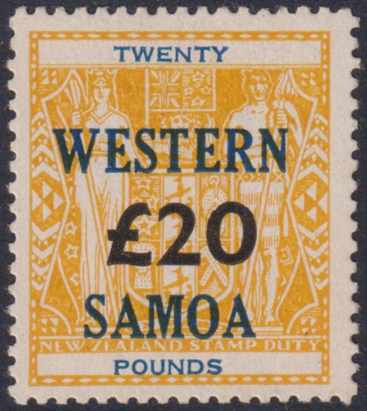 Samoa 1947 £20 Arms yellow & black, "WESTERN/ £20 / SAMOA" ovpt (black). WT paper, multiple wmk (upright). Not listed by SG. Issued primarily for fiscal purposes but also available for postage use (philatelic use on piece is known). Very rare. Ex Don Mee. Mint.